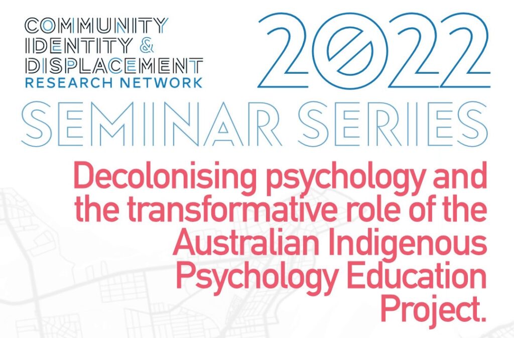 Decolonising psychology & the role of the AIPEP Dudgeon, P., Selkirk, B., & Alexi, J. (2022, March 24). Decolonising psychology & the role of the AIPEP [Video]. Community Identity & Displacement Research Network, Victoria University. https://www.youtube.com/watch?v=zc3pTXQUXdQ ABSTRACT