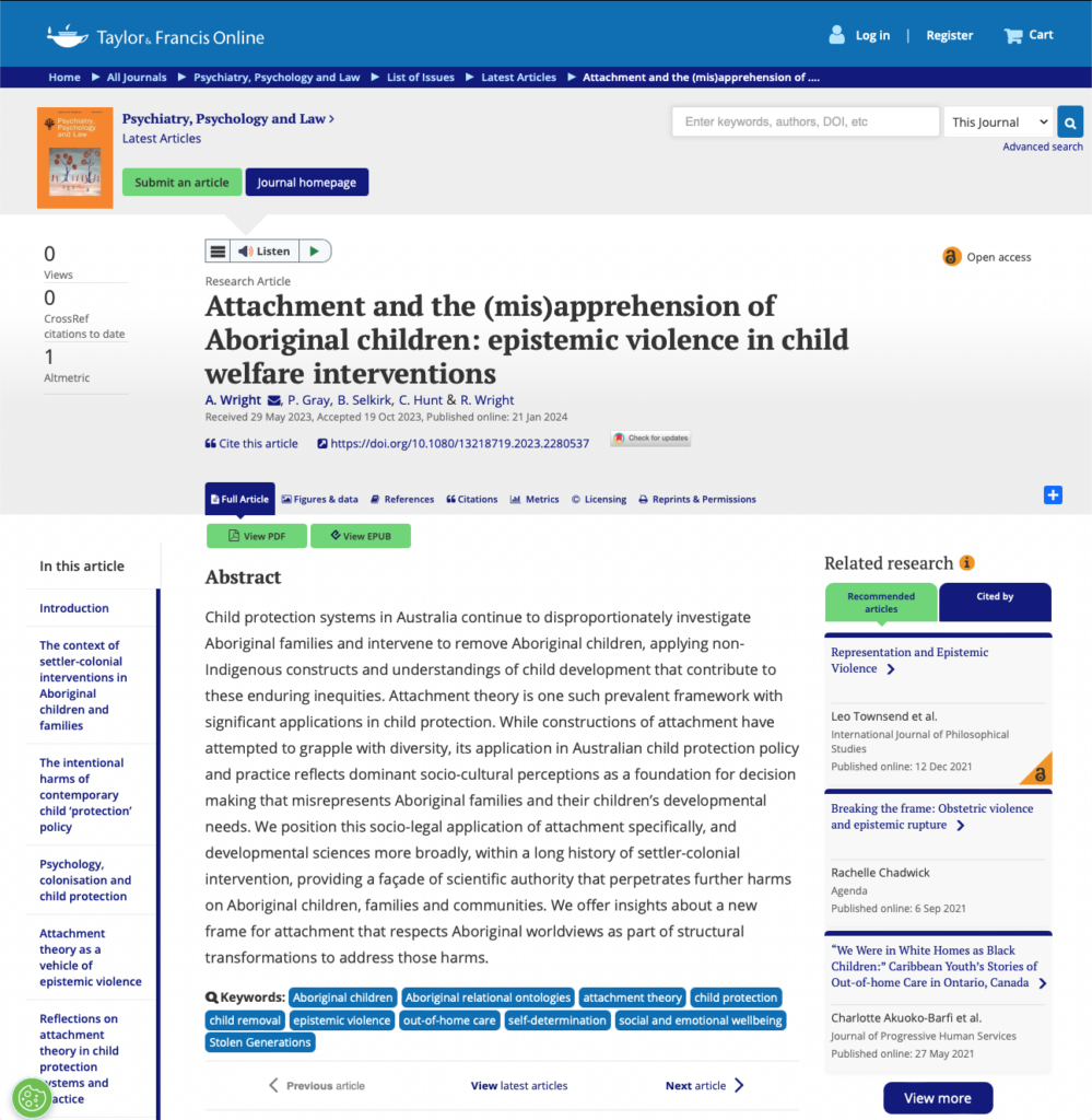 Embracing Social and Emotional Wellbeing Can Create Transformational Change in Psychology Selkirk., B., Alexi, J., Hirvonen, T., & Dudgeon, P. (2025). Embracing Social and Emotional Wellbeing Can Create Transformational Change in Psychology. In S. Bhatia, J. S. Fernández, & C. C. Sonn (Eds). Decolonial Psychology: Academic and Activist Perspectives. Taylor & Francis Group. ABSTRACT Aboriginal […]